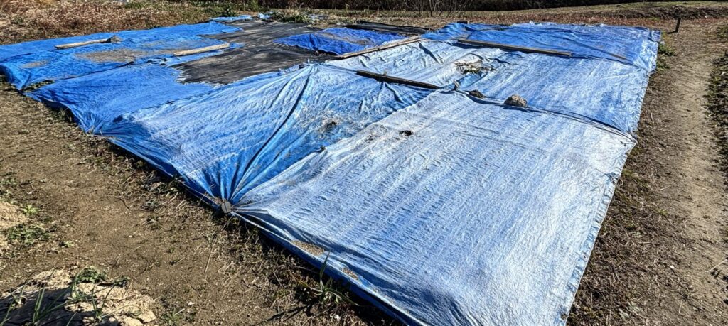 - 状態: 1年間の放置により、ブルーシートで雑草予防はされているが土が踏み固められている